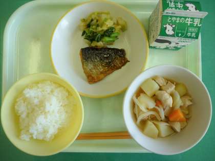 今日の給食は、ごはん、牛乳、さばのみりん焼き、おひたし、南蛮煮です。