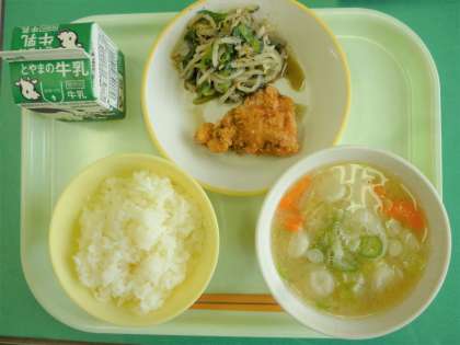今日の給食は、ごはん、牛乳、豚肉の香り揚げ、よごし、つみれ汁です。