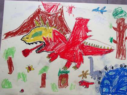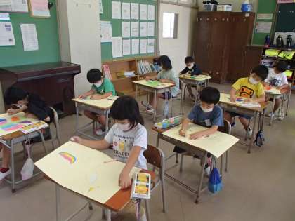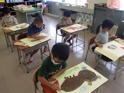 図工では、「のってみたいな いきたいな」の学習をしています。前回は、自分が乗ってみたいものを想像しながら、画用紙に描きました。今日は、行ってみたいところをみんなで話し合いました。「おかしの国」「恐竜の世界」「宇宙」「海の中」など、子供たちの発想は豊かでした。友達の話も参考にしながら、自分の描いた絵に、行ってみたい場所を描き足していきました。次回は、乗っている自分を描いていく予定です。