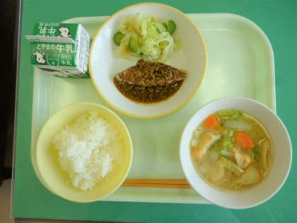 今日の給食は、ごはん、牛乳、ふくらぎのごまだれがけ、あわせ合え、五目みそ汁です。