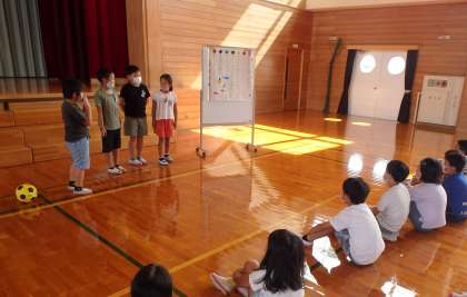 それぞれの係で考えた企画をしてくれました。今日はスポーツ係からの「ドーナツキックベース」お笑い係からの「転がしドッジボール」をしました。