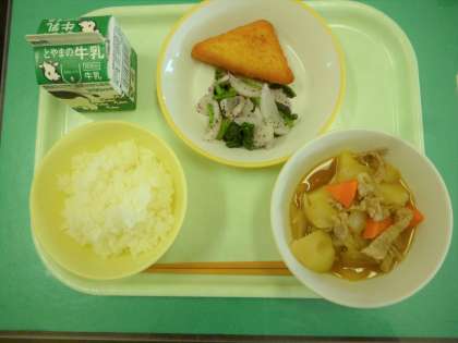 今日の給食は、ごはん、牛乳、肉じゃが、はんぺんフライ、ゆかり和えです。