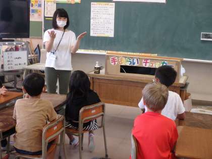 保健の授業では、ブラックライトを用い、水だけで手を洗った場合と、石けんを使って洗った場合を比べました。