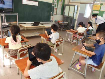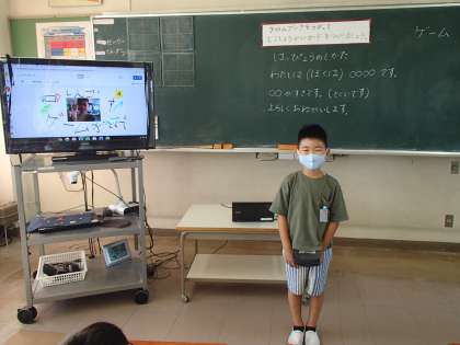 今日の生活科は、クロムブックを使って、自己紹介カードを作りました。自分の写真を入れて、名前やすきなもの、得意なことを書いたり、模様を描いたりして、楽しく作りました。端末上で出来上がったワークシートをみんなに見てもらいながら、一人ずつ発表しました。