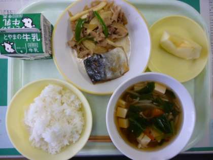今日の給食は、ごはん、牛乳、さばのみそ煮、マコモタケのオイスターソース炒め、きのこ汁、りんごです。