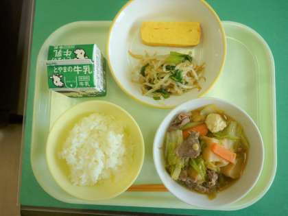 今日の給食は、ごはん、牛乳、厚焼き卵、おひたし、すきやきです。