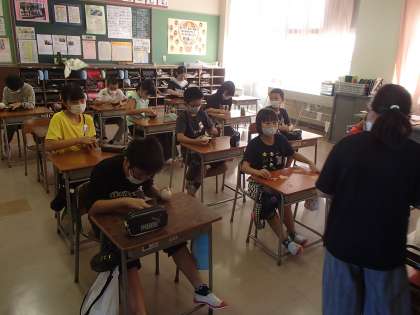 今日の2限は総合的な学習の時間でもみすりを行いました。自分たちで収穫したお米を乾燥させ、今はもみすりを行っています。もちつきのためには、期日を守ってもみすりを行う必要があり、とても総合的な学習の時間だけでは終えることができないので、朝の時間や休み時間にも取り組んでいる人もいます。どうにか効率的にできないものかと、友達と協力したり相談したりしています。