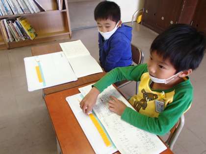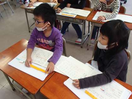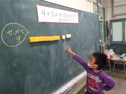 算数では、繰り上がりのあるたし算の学習をしています。どのように計算するとよいかを、ブロックをつかって考えています。今日は、自分の考えをペアの友達に説明しました。