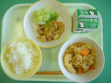 今日の給食は、ごはん、牛乳、あっさりチキン、ゆでキャベツ、厚揚げの錦とじです。