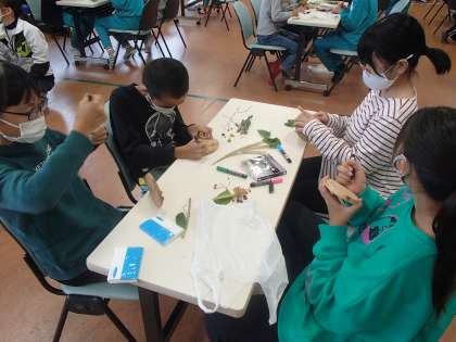 午後からは、登山をする中で素敵な木の枝や木の実、葉等を拾い、ウェルカムプレートづくりをしました。一人一人拾ってきたものが違っていたので、個性的なプレートが出来上がりました。