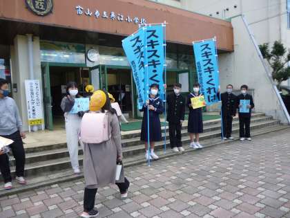 呉羽中学校の1年生(寒江小学校の卒業生)が玄関前で委員会の子供たちといっしょに挨拶運動をしてくれました。呉羽校区に気持ちのよい挨拶が広がるといいですね。来週月曜日も来てくれますよ。