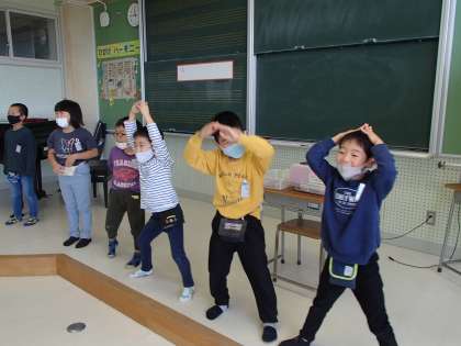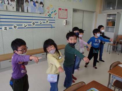 今日の音楽は「やまびこごっこ」をしました。「やまびこさん」の歌に合わせて、人間チームとやまびこチームに分かれて、歌いました。チームのみんなで相談して、ジェスチャーをつけて、楽しみながら歌いました。