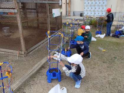 生活科では、春から育ててきたあさがおのつるを刈り取りました。支柱にからまっていたつるを、なるべく長いまま刈り取ることを、がんばりました。つるは、リースにして、かざる予定です。