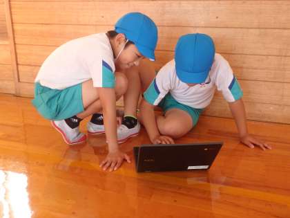 体育のマット運動では、クロムブックを使って動画を撮り、自分の動きを客観的に見て、どうしたら「きれいな前転・後転」になるか考えながら練習しています。