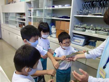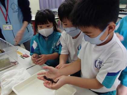また、アオダイショウやクサガメ、ホクリクサンショウウオ、ヒキガエルなど、7種類の生きものを触ってみました。どの子も怖がることなく、興味津々で生きものと触れ合っていました。