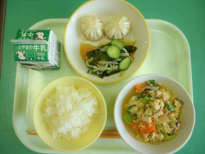今日の給食は、ごはん、牛乳、炒り豆腐、えびパオツ、きゅうりとわかめの酢の物です。
