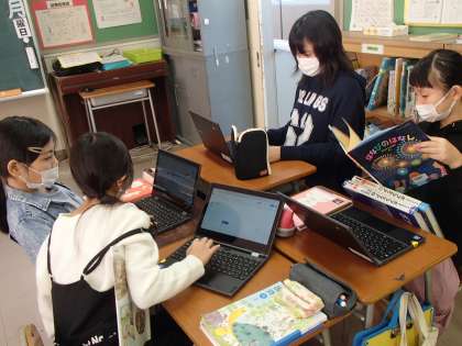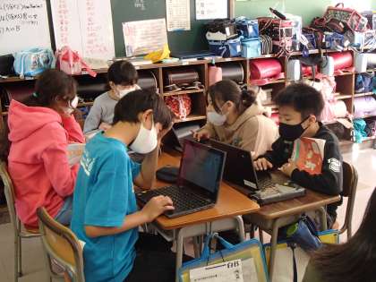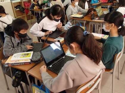 国語科「日本文化を発信しよう」では、グループに分かれて、自分たちが紹介したい日本文化についてパンフレットをクロムブックで書いています。今日は、グループごとにパンフレットの構成を考え、書き始めました。花火、相撲、和菓子、獅子舞、日本の行事、俳句等自分たちが発信したい文化について、読み手をひきつける工夫を交えながら仕上げることが目当てです。「海外との違いをのせたらおもしろいんじゃない?」「画像をのせると分かりやすいよね」などと相談をしながら進めているようです。さて、日本文化の魅力を伝えることができるのでしょか。