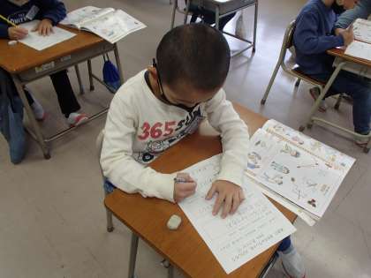 今日の生活科は、集めた落ち葉や木の実で、どんなことをしたいか話し合いました。子供たちは、どんぐりごま、どんぐりめいろ、落ち葉のおめんや洋服、オナモミの魚つり、まつぼっくり人形など、たくさんのアイデアを発表していました。そのあとは、自分が、やってみたいなと思っていることを、絵や文でワークシートにかき、整理しながら考えました。