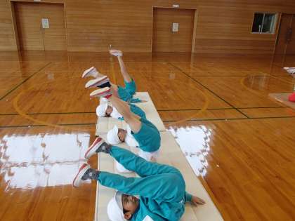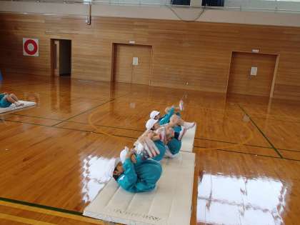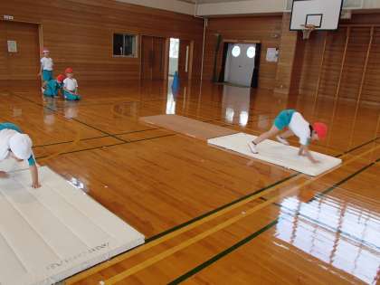 体育では、マットを使った学習をしています。今日は、くまさん歩きや、だるまさん、スカイツリーなど、マットを使って遊びました。そのあとは、前転がりと後ろ転がりに挑戦しました。