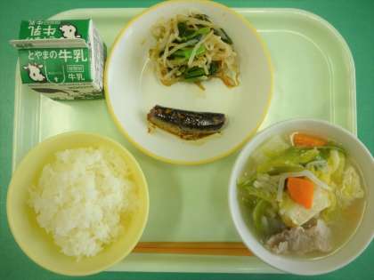 今日の給食は、ごはん、牛乳、塩こうじ鍋、いわしの土佐煮、おひたしです。