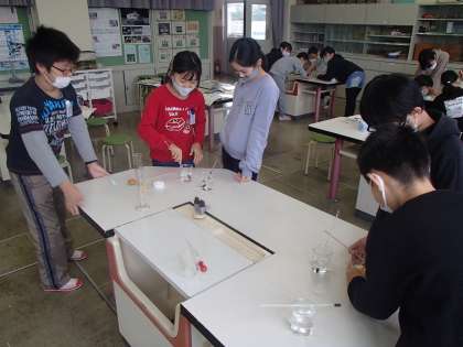 理科「物のとけ方」の学習で、以前予想を立てたことについて、実験を行いました。メスシリンダーを使用して水の量を量ったり、計量スプーンで計量する際に割り箸を使用してすり切り一杯になるように気を付けたりするなどして、食塩やミョウバンの溶ける量が変わることを実感していました。