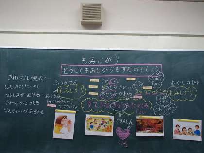 今日の道徳は、日本人の心について、考え話し合いました。資料文「もみじがり」を読んで、もみじがりが何百年も続いているのは、美しい自然を楽しみ、大切にしていきたいから、など話し合いました。