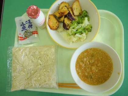今日の給食は、ソフト麺の肉味噌かけ、大学芋、花野菜サラダ、味付け小魚、飲むヨーグルトです。