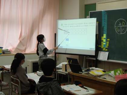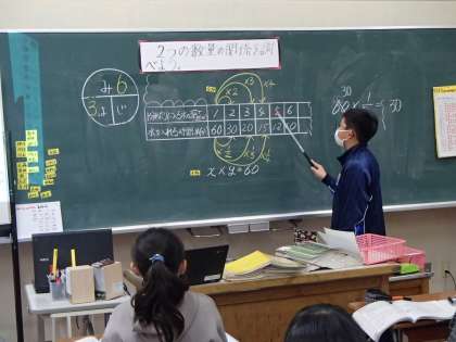 算数科では、比例の学習が終わり、反比例の学習に入りました。子供たちは、表からいろいろな決まりを見つけ、それを伝え合いました。「比例と反比例は法則が違うけれど、同じ幅で考えることは同じだ」と共通点を見つけている子供もいました。「答えを求める」ことは当たり前なのですが、それより「どう考えたのかを伝える」ということを大切に授業をしています。以前より、たくさんの子供が自分の言葉で考え方を伝えられるようになってきました。