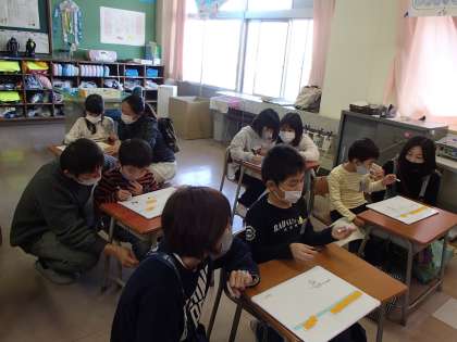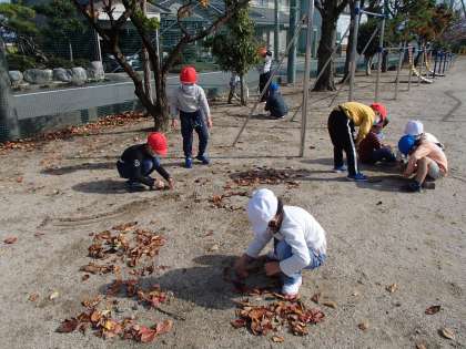 今日の図工は、「ならべて ならべて」の学習をしました。今日は、気持ちのよい秋晴れだったので、落ち葉、木の枝、石ころなどつかって、外で造形あそびをしました。お皿にのったやきとり、ヨット、落ち葉のリースなど、楽しい作品がたくさんできました。最後に、友達の作品をみんなで見合いました。