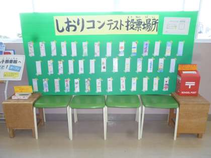 今月は読書月間です。子供たちは「読書でビンゴ」に進んで取り組み、貸出数も増えています。先日より「しおりコンテスト」を行っています。ただいま投票中です。さて、どれが選ばれるでしょう?