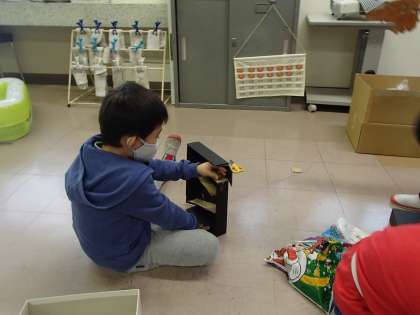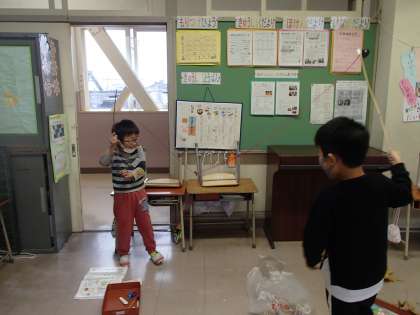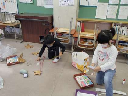 生活科では、秋のものを使って、おもちゃづくりを始めました。今日は、自分が考えた設計図をもとに、おもちゃをつくりました。「オナモミの実で、葉っぱをつるときどうしたらいい?」「どんぐり迷路をつくったよ。どんぐりがころころ転がるよ」など、友達と話したり、協力したりしながら、おもちゃづくりに取り組みました。どんなふうに出来上がるのか、みんな楽しみにしています。