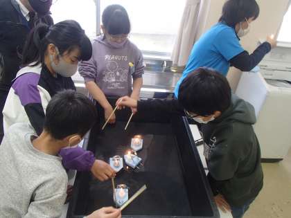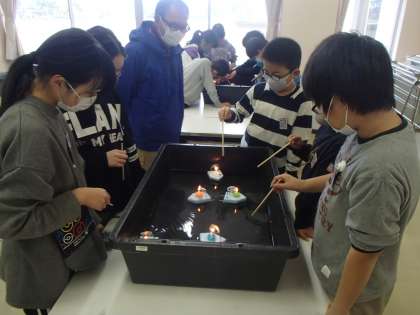 つくった船は家庭科室に並べられた水槽の中に浮かべました。子供たちは「うまくいくかな」と心配そうでしたが、ろうそくに火をともしてみると、みるみる船が進み始めるのを見て、歓声があがりました。一人一人の船は進むスピードや回転の仕方が違い、どれもすてきな船になっていました。