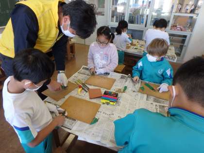 3年生は、小刀を初めて使った子が多く、「手が痛くなってきた」「力がいるな」など、木の枝を削るのに手こずっている様子でした。でも、時間が経つにつれ、こつを覚え、上達していきました。