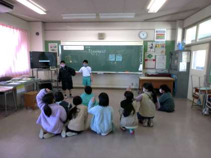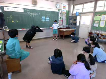 今日のげんきタイムに、スポーツお笑い係主催の「ジェスチャーゲーム集会」をしました。計画から進行まですべて自分たちで企画し、クラスみんなで楽しい集会をすることができました。