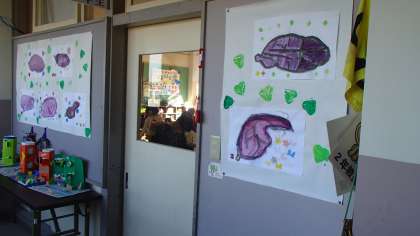 子供がえがいたさつまいもの絵の周りに、さつまいもでつくった葉っぱのスタンプいっぱいのさつまいも作品が完成しました。