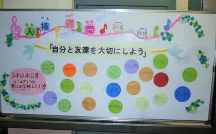 12月4日(土)〜10日(金)は人権週間です。今朝は放送で担当者より「人権」とは何か、また、みんなが明るく楽しく暮らせるようにしようと投げかけがありました。各教室では、生活振り返りカードを記入し、「相手の気持ちを考えて行動すること」について各自が振り返りました。玄関前には、計画委員会が考えた「ふわふわ言葉」が掲示してあります。温かい言葉があふれるすてきな寒江小学校にしていきたいです。