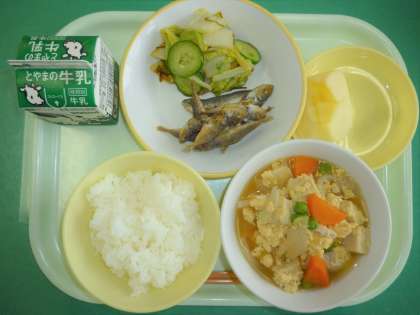 今日の給食は、ごはん、牛乳、小あじのから揚げ、白菜ひたし、親子煮、りんごです。りんごは地域の方からいただきました。ありがとうございます。