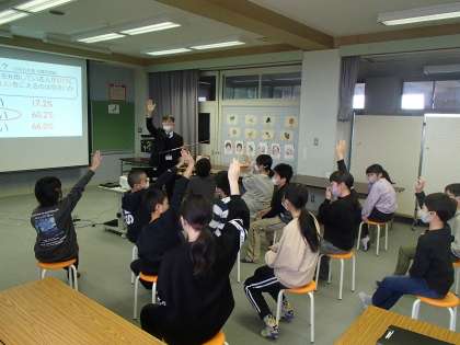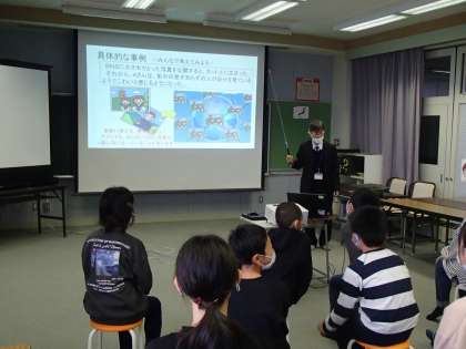 そもそも情報モラルとは何なのかについて説明していただいたり、これまでに富山県内や全国で実際に起こったトラブルや事件から、ネットの利用にはどのような危険が潜んでいるかについて教えていただいたりしました。先生のお話や資料が工夫されていて、5年生の子供たちは楽しく学習することができました。