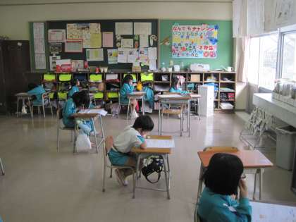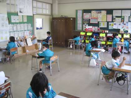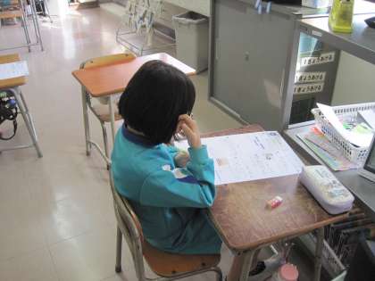 かけ算のテストを行いました。勉強した成果はしっかり発揮できたかな?写真は真剣にテストに取り組む様子です。
