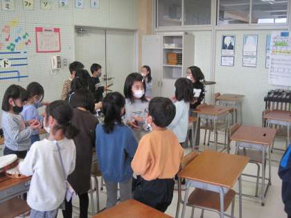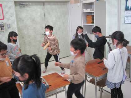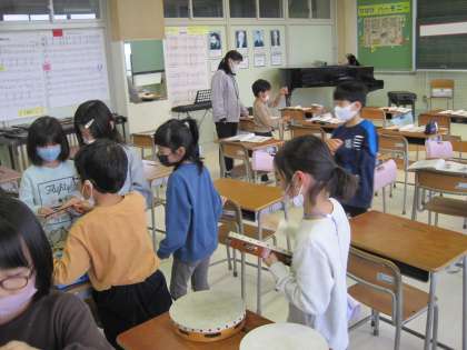 楽器を使ってリズムを組み合わせる学習を行いました。写真は決めたリズムをいろいろな楽器で試している様子です。明日は呼びかける役と答える役に分かれてリズムで会話をしてみます。どんな音楽が出来上がるのかとっても楽しみです。