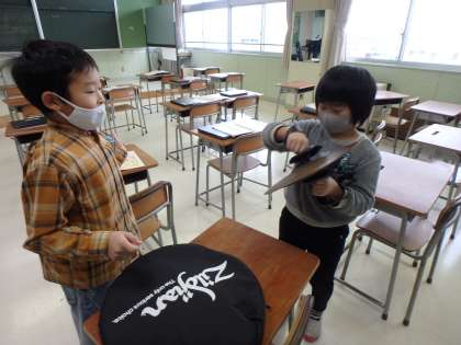 どんな鳴らし方をすればどんな音が鳴るのかいろいろ試しながら、「まほうの音楽」にぴったりくる音を見付けていました。