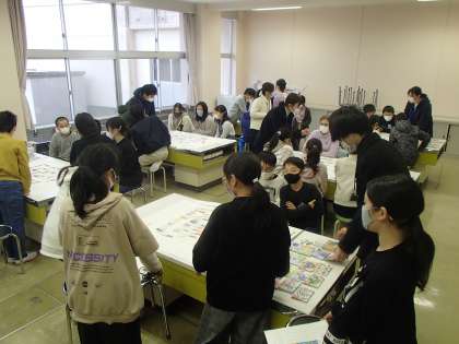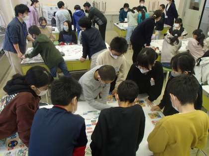 今日の2、3限に富山国際大学の学生さんたちが来てくれて、一緒にSDGsについて学習しました。学生さんたちが富山県をテーマにした「SDGsすごろく」を用意してくれたので、それをグループの人たちと楽しく取り組みました。