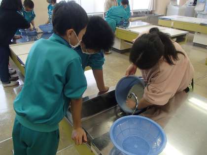 その後、明日のもちつき集会に向けて、餅米の準備を行いました。グループの人と協力して、1グループ3kgの餅米を洗い、水に浸しました。