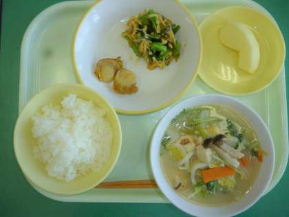 今日の給食は、ごはん、牛乳、ほたての香味焼き、はりはり和え、ごま豆乳鍋、りんごです。