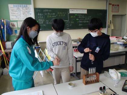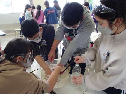 理科「水溶液の性質とはたらき」の学習では、「炭酸水には、どんな気体がとけているのか」について考え、実験を行いました。子供たちは、班の友達と協力しながら炭酸水に入っている気体を試験管に集めたり、その気体が何かを確かめるために、火のついた線香を試験管の中に入れたり、石灰水を入れてふったりしました。「線香を入れたら火が消えた」と驚く子供たち。答えは分かっていても実際に実験をして確かめることで、より理解ができたのではないかなと思いました。