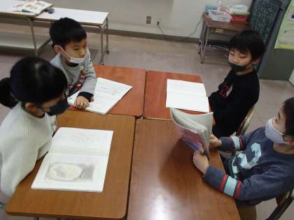 昨日の国語は、グループで友達の話を聴き合いました。発表する人は、好きな本の題名、登場人物、おもしろいところや好きなところなど、伝えました。聴いている人は、もっと知りたいことは何か考えながら聴き、後から質問しました。