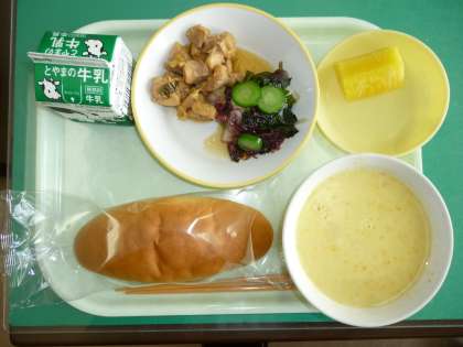 今日の給食は、コッペパン、牛乳、あっさりチキン、海藻サラダ、野菜ポタージュ、カットパインです。