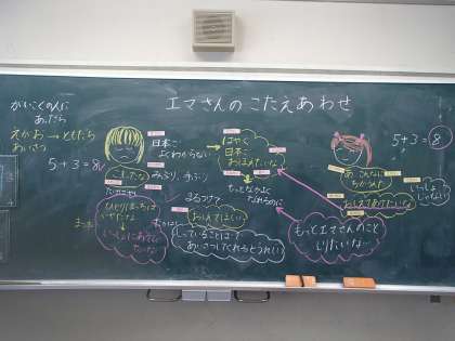 今日の道徳は、外国からきた人となかよくするには、どんなことが大切かみんなで話し合いました。資料文から、オーストラリアの学校では、丸付けをするとき、丸ではく、「☑」をつけていくことに、みんな驚いていました。文化や習慣がちがっても、笑顔であいさつしたり、いっしょに遊んだりすることで、仲良くなれるなど、考えていました。