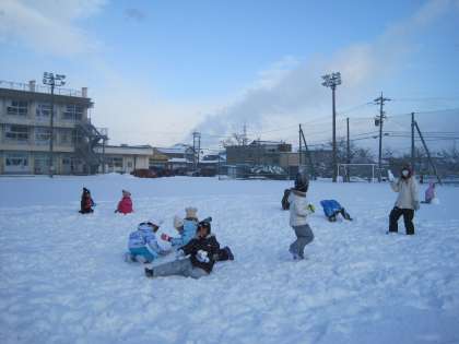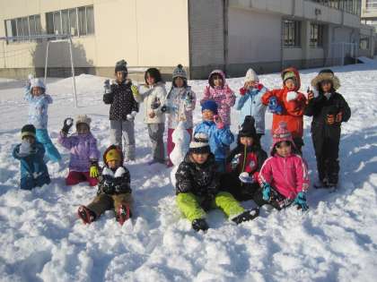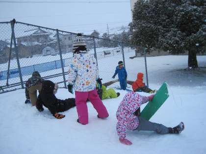今日はみんなで雪遊びをしました。子供たちは、そりをしたり雪だるまや滑り台を作ったりするなど楽しんでいました。また遊べたらいいね。