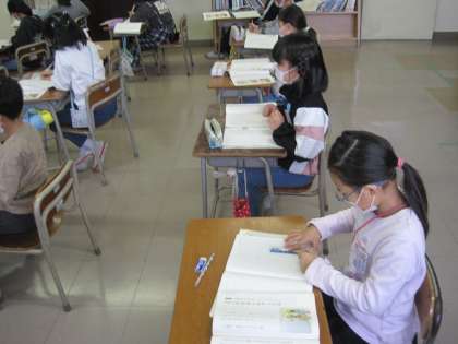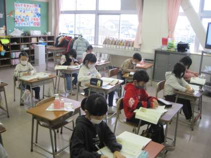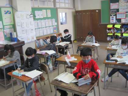 国語科では「ようすをあらわすことば」について学習しています。様子を表す言葉には、「はげしく」「たくさん」などどれくらいかを表したり、「ざんざん」「ザーザー」など言葉の響きや聞こえてくる音によって表したりするなど、いろいろな言い方がありました。明日は、「例え」を使った様子の表し方を学習します。いろいろな言葉や言い方ををどんどん覚えてほしいと思います。